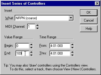 NOTE: I'm expressing all values in decimal instead of hexadecimal. Also, I'm assuming a MIDI channel of 1 (ie, actually 0), so that's why I show a 176 above for the MIDI Controller Status. Of course, MIDI channel 2 would be a MIDI Status of 177. MIDI Channel 3 would be 178. Etc. If you're using a sequencer program to enter these messages, the program will probably figure out the status for you -- you only need to tell the sequencer that you want to enter a MIDI controller event, with a controller number of 99, and for the data value, enter the low bits of your desired parameter number (above, that's 109).